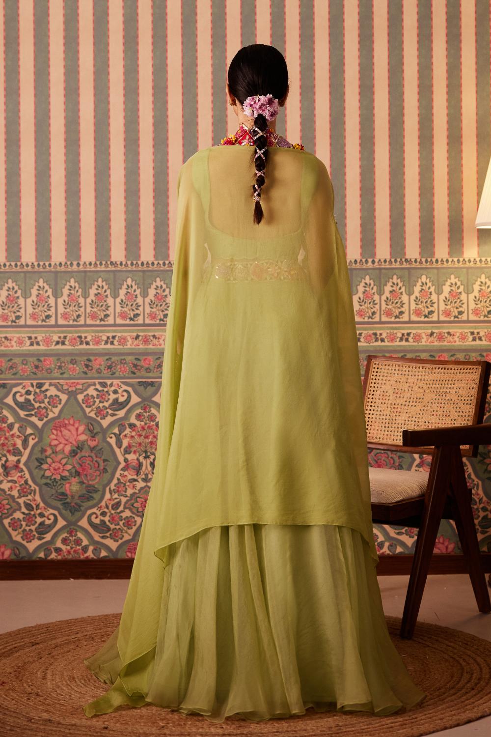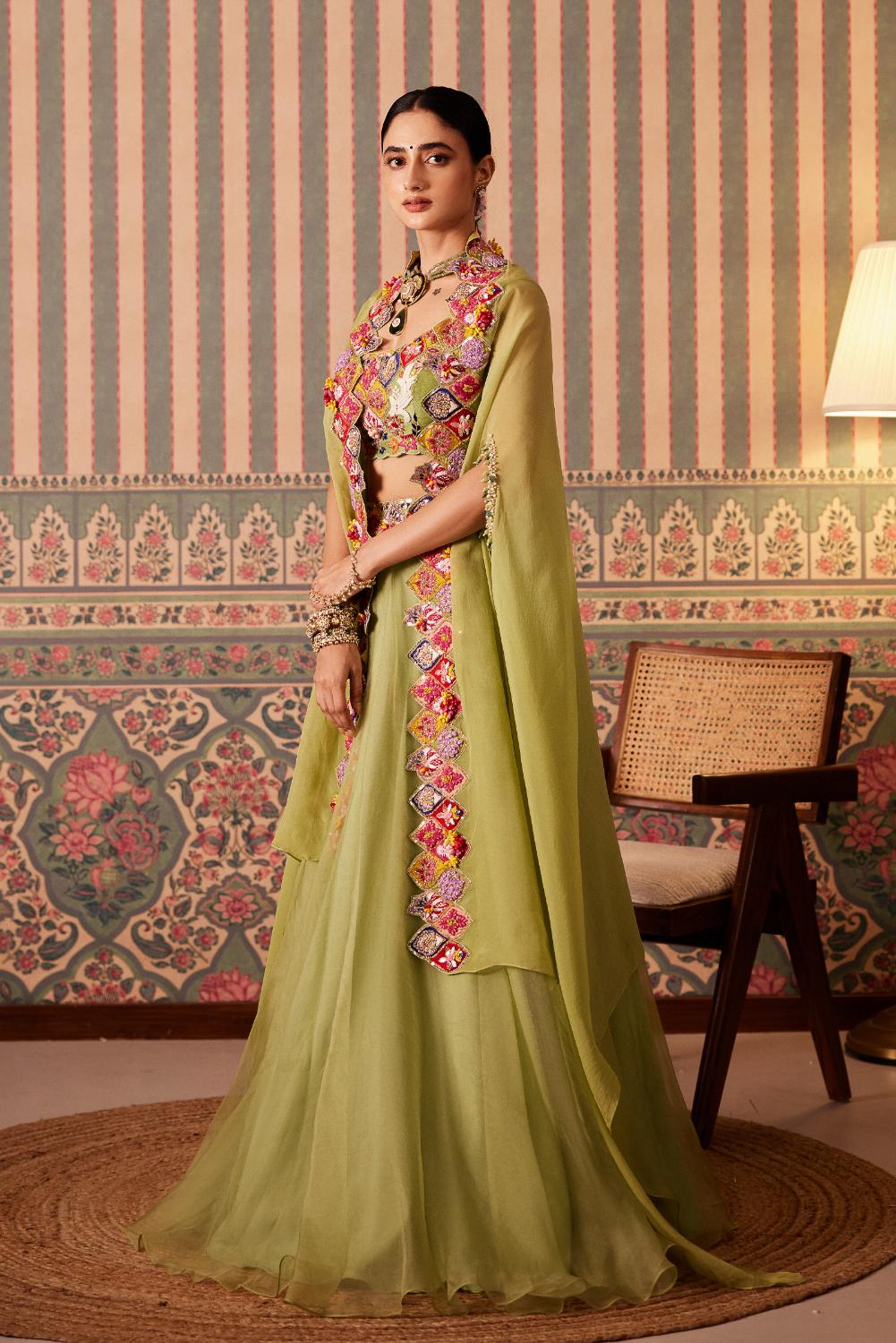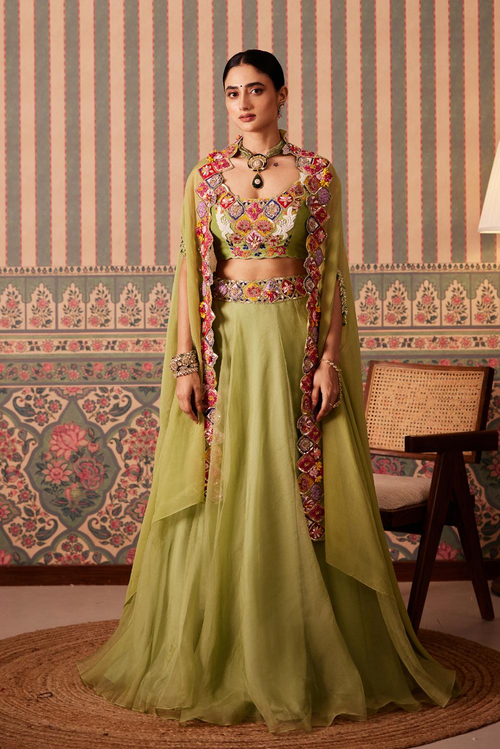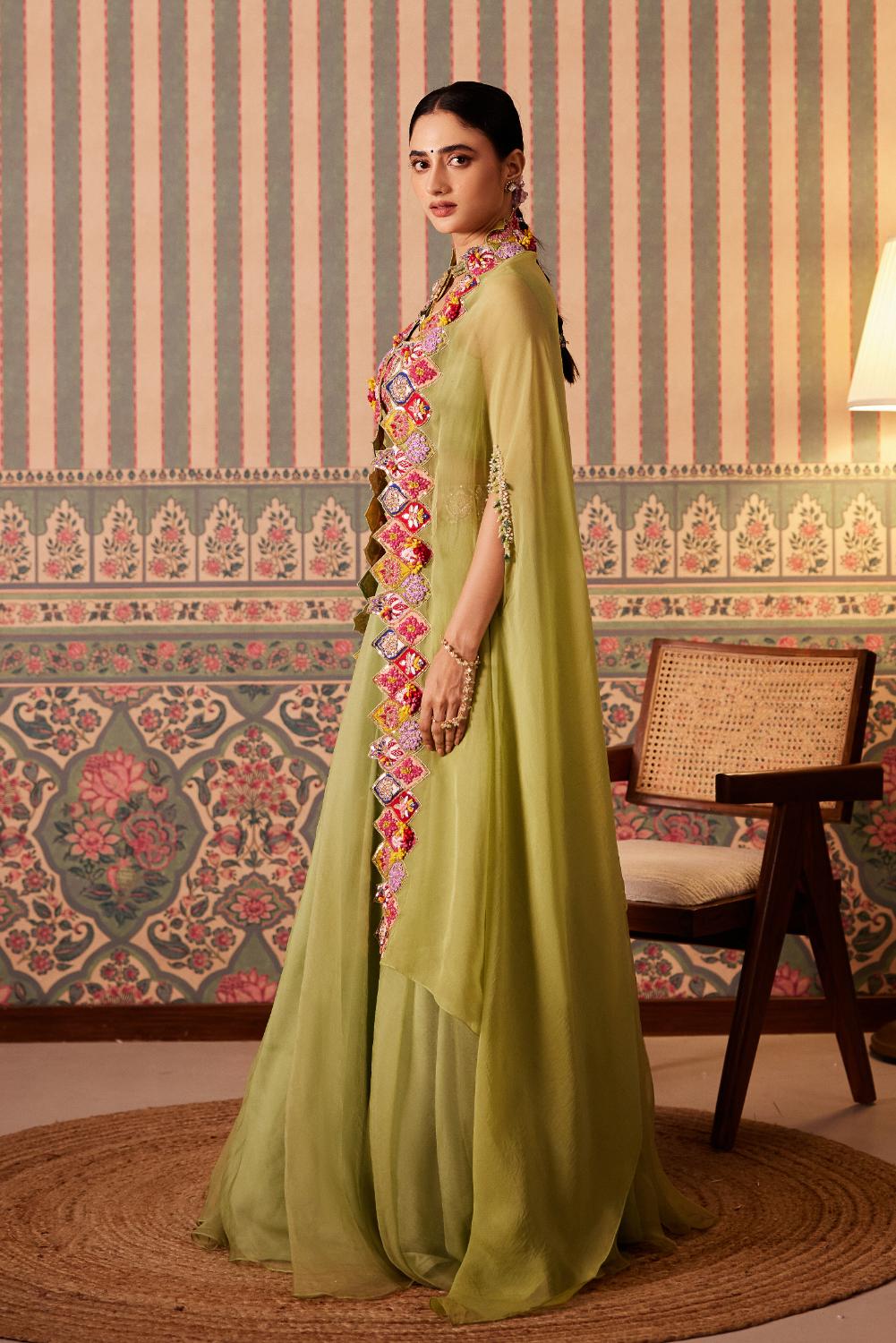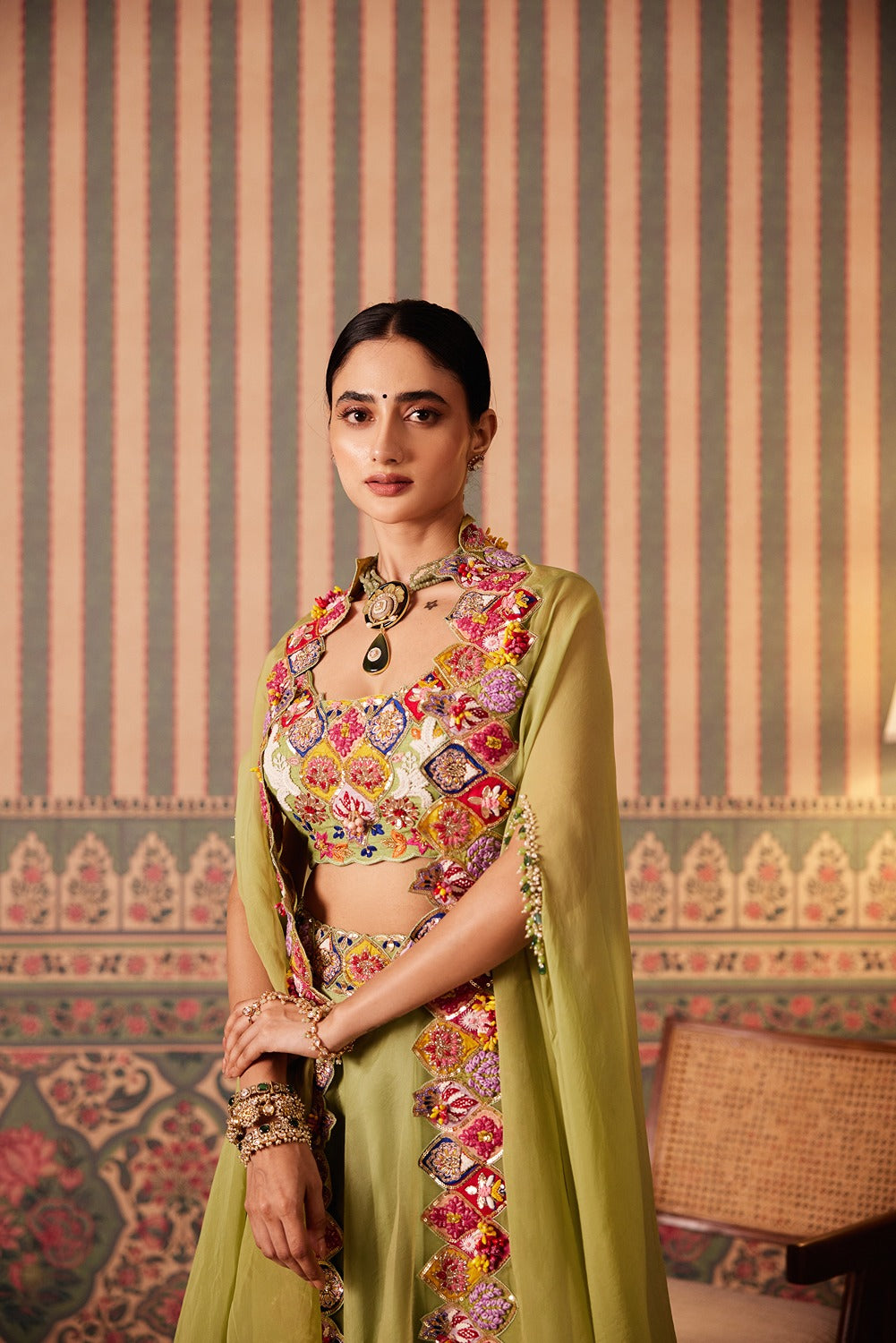 A green cape lehenga set featuring hand-embroidered cutwork on the blouse with 3D floral appliqué. The cape and lehenga are detailed with delicate floral appliqué, multicolored threadwork, and intricate hand embroidery. Sequins and beads embellish the outfit, while pearl tassels are attached to the sleeves, adding a refined touch.