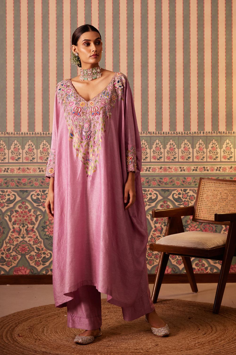 A dusty rose anti-fit silk kaftan showcasing exquisite 3D butterfly appliqué handwork and vibrant hand-painted butterflies and leaves, with intricate detailing on the front and back. The design features hand-embroidered multicolored threadwork, complemented by sequins, cutdana, and pearl detailing. The cutwork V-neckline adds elegance, while the sleeve cuffs feature the same meticulous handwork.