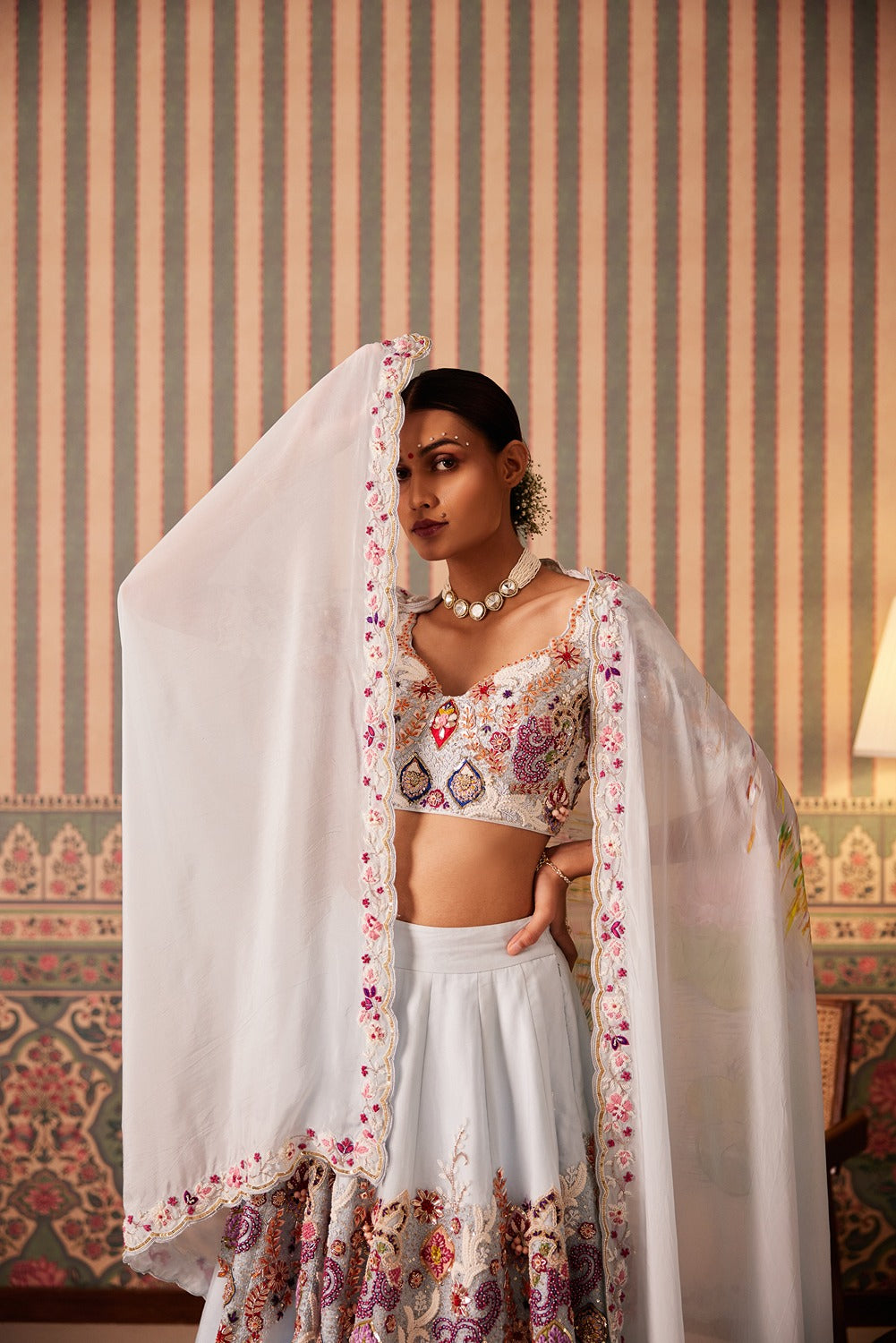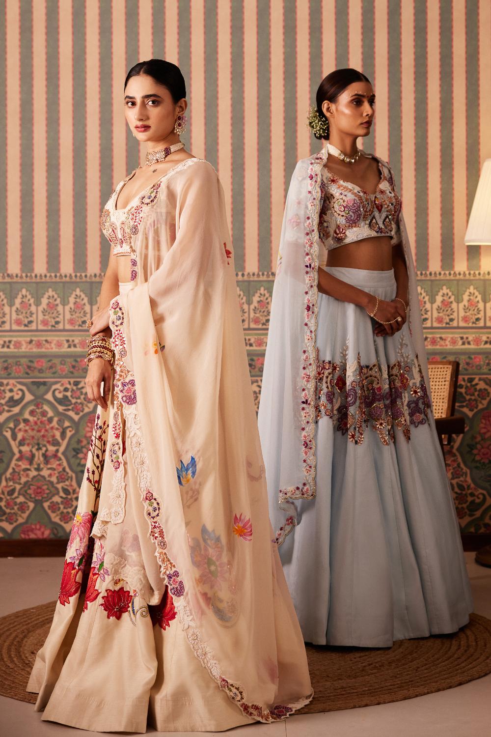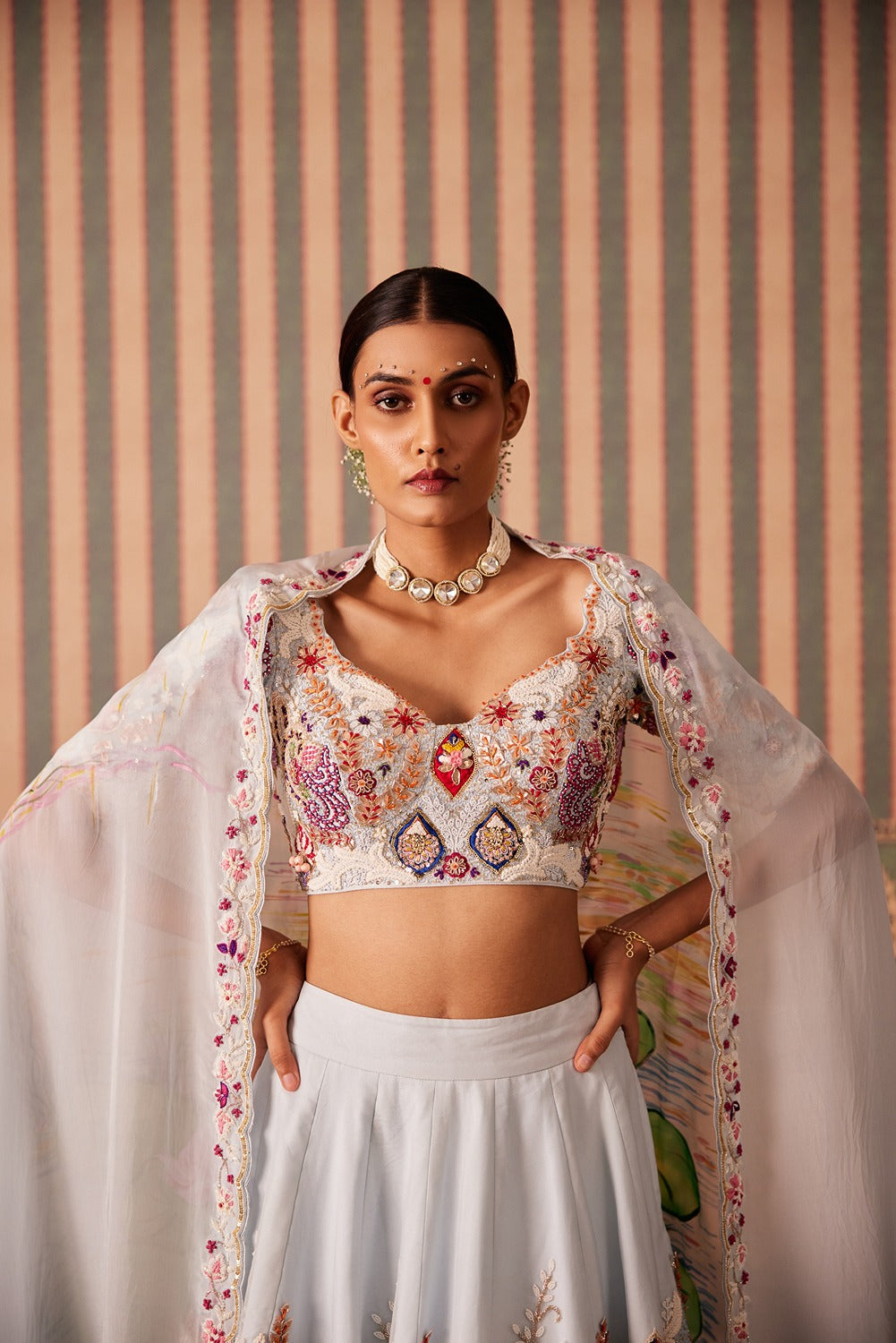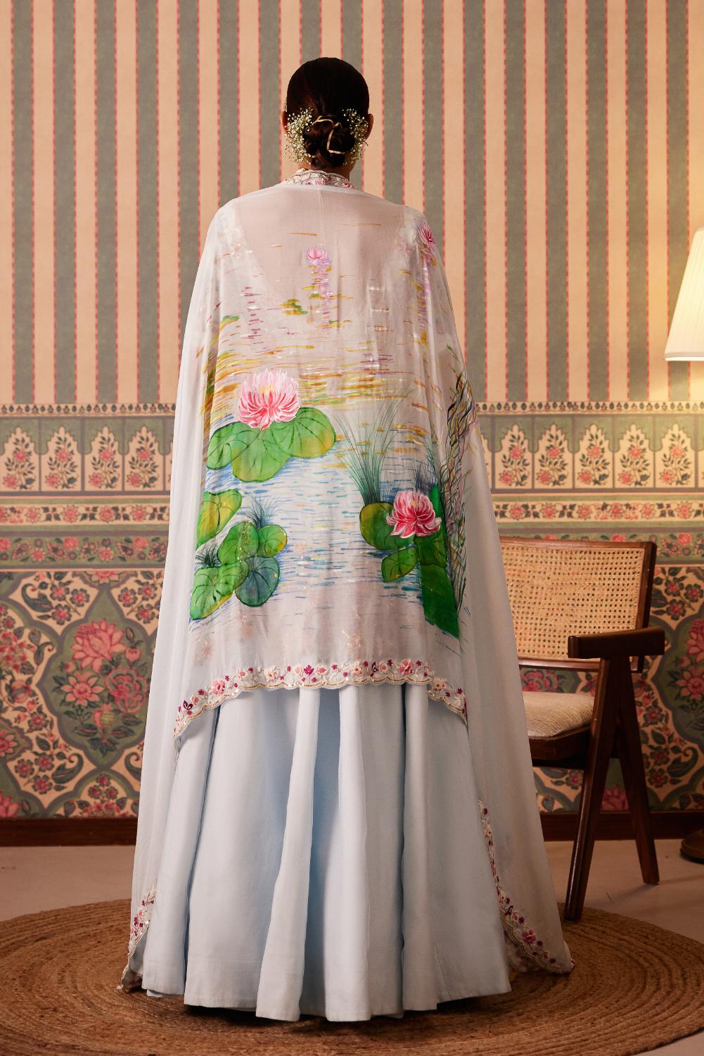 A powder blue lehenga set featuring delicate 3D floral appliqué work, complemented by multicolored threadwork, gota detailing, and sequins for added dimension. The lehenga and deep cutwork blouse both showcase intricate embellishments that enhance the overall aesthetic. The hand-painted dupatta is inspired by a serene lily pond theme, with soft hues and detailed brushstrokes bringing the design to life. It is finished with an intricate cutwork border, providing a refined touch.