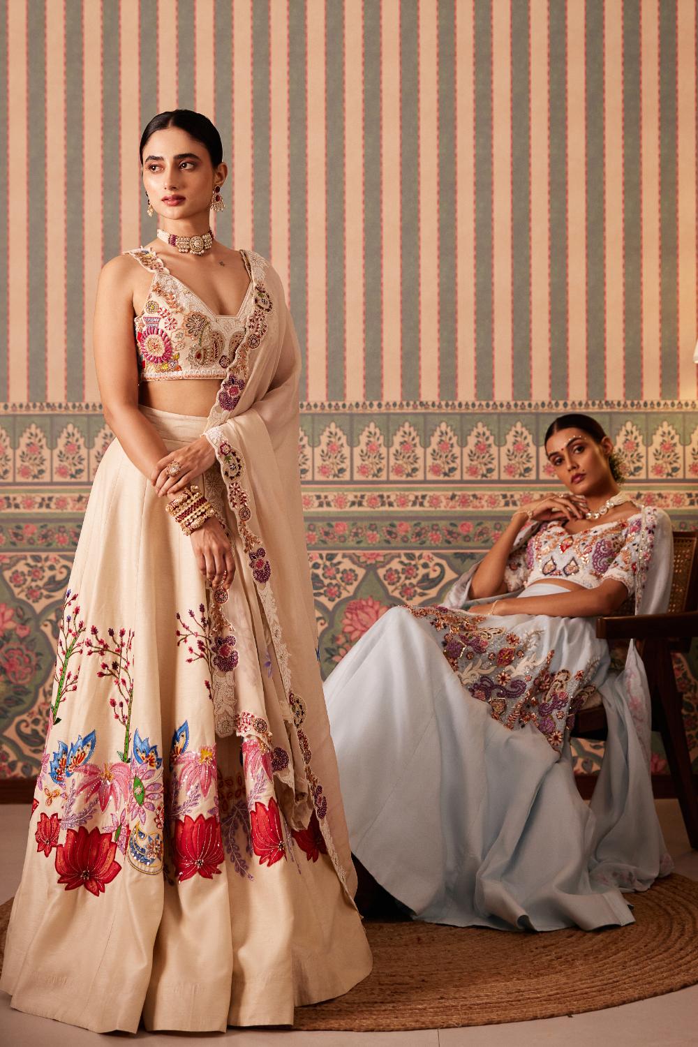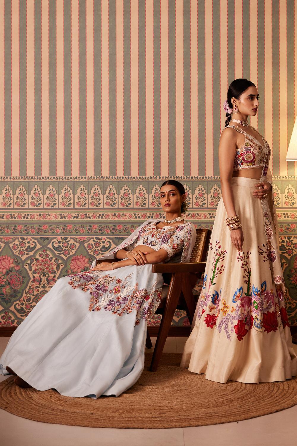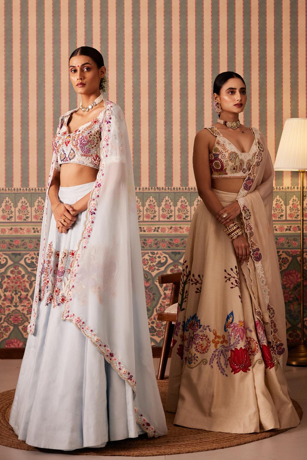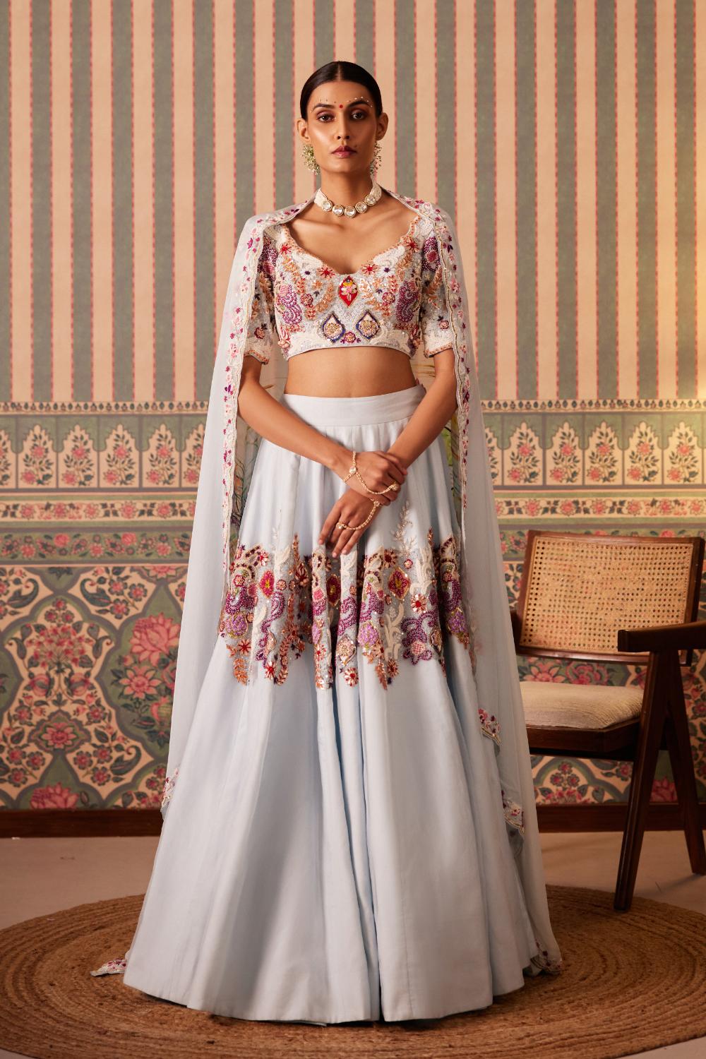 A powder blue lehenga set featuring delicate 3D floral appliqué work, complemented by multicolored threadwork, gota detailing, and sequins for added dimension. The lehenga and deep cutwork blouse both showcase intricate embellishments that enhance the overall aesthetic. The hand-painted dupatta is inspired by a serene lily pond theme, with soft hues and detailed brushstrokes bringing the design to life. It is finished with an intricate cutwork border, providing a refined touch.
